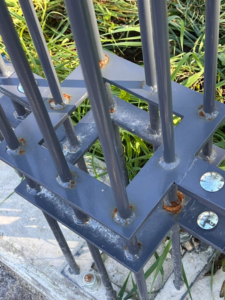 Recinzione realizzata in difformità dal progetto approvato: il progetto approvato in variante prevedeva che tutta l’inferriata di recinzione del parco fosse “affogata” in plinti di cemento armato. È stata invece posata sopra i plinti, fissata con bulloni e filettature esposte alle intemperie che già oggi hanno sviluppato immancabilmente fenomeni corrosivi quali la ruggine. Trattasi di una scelta costruttiva che riduce significativamente la durabilità dell’opera e che solleva interrogativi sul risparmio conseguito da chi ha eseguito il lavoro in modo difforme.
